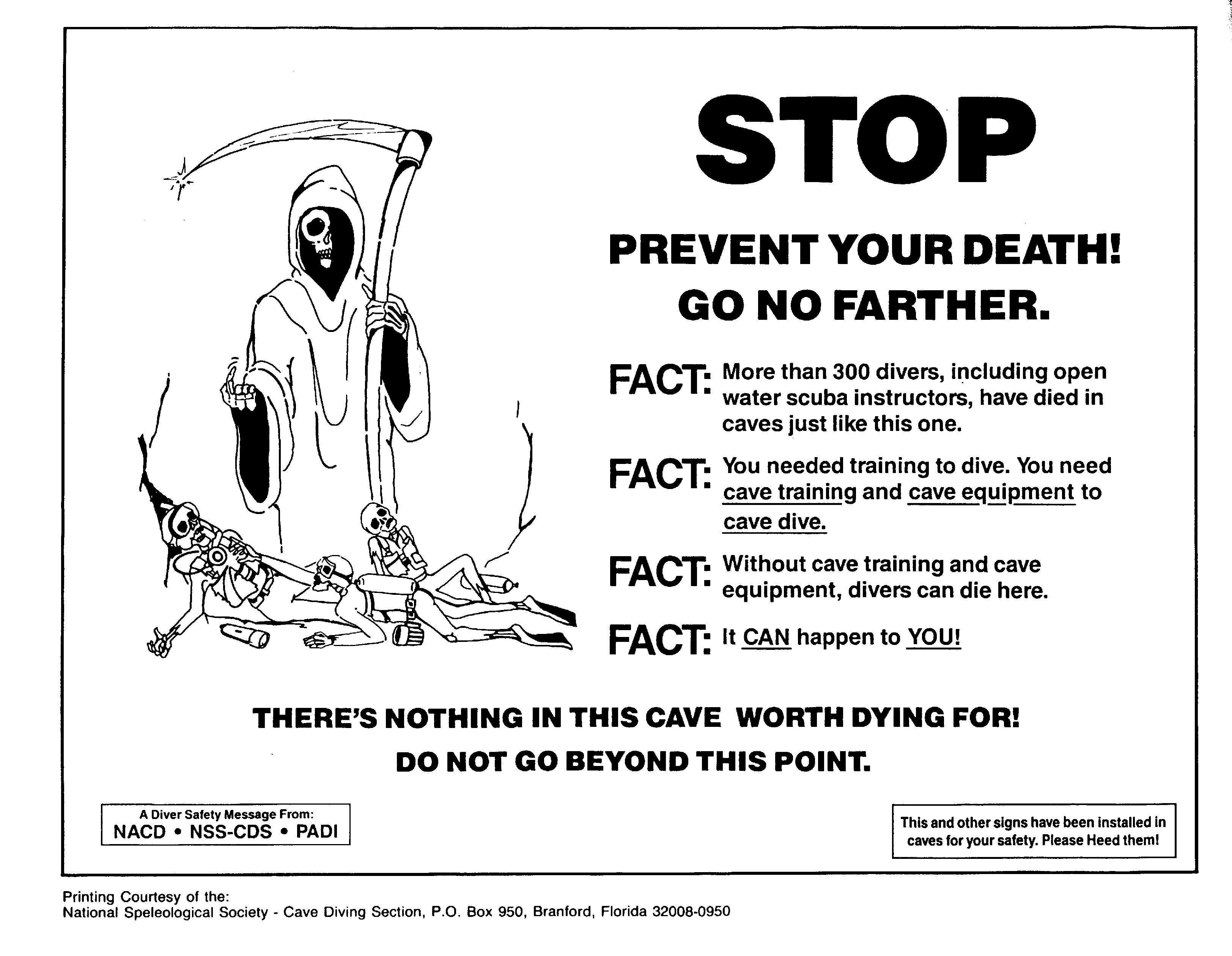 | WARNUNG: Höhlentauchen ist eine sehr spezielle Form des Tauchens, die ausserordentliche Ansprüche an Ausrüstung, Ausbildung und die mentale Stabilität der Ausübenden stellt. Keine noch so gute Freiwasserausbildung kann Dich auf die speziellen Gegebenheiten der Höhlenumgebung vorbereiten. Die meisten Unfälle im Höhlenbereich haben sich ereignet, weil Taucher einfach nur „mal reinschauen“ wollten. |